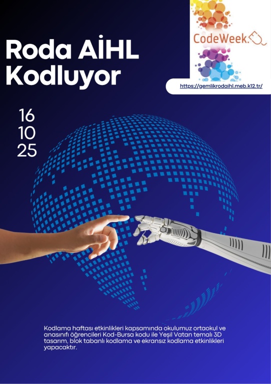 Okulumuz CodeWeek 2025 kod haftası etkinliklerine anasınıfı, ortaokul ve lise öğrencilerimiz ile katılım sağlayacaktır. Kod haftası boyunca ekransız kodlama, blok tabanlı kodlama, wordwall etkinlikleri ve robotik kodlama tanıtımları yapılacaktır.